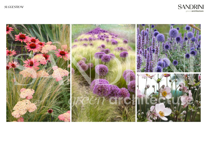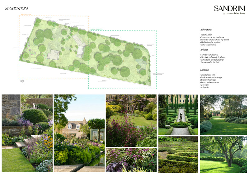 La struttura botanica e architettonica viene simbolicamente suddivisa in “Villa” e “Parco” al fine di concentrare le attività umane in uno spazio ben definito, impreziosito tra le altre cose da collezioni botaniche di raffinata bellezza, e dedicarne il restante al vasto giardino, con maneggio, biolago ornamentale e voluminose aiuole complete di grandi alberi e arbusti, vivaci graminacee e prosperose macchie di erbacee perenni.